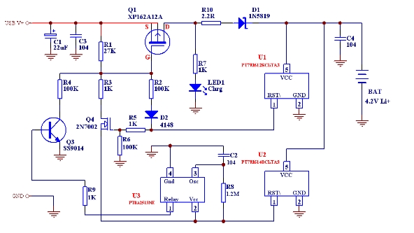 PT7M7433T是上海百利通公司最新設(shè)計的極高精度的一系列電壓檢測器的其中一款,其檢測精度在0-Vcc (5.5V)范圍內(nèi)小于1mV,而且其批量IC的檢測值偏差<±2.5%,這樣完全保證了批量產(chǎn)品的性能一致性和極高的總體性能,我們利用其配合少量外部電路即可組成相當(dāng)簡單的鋰電池充電線路。