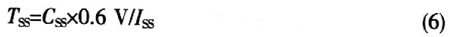 該器件無允許快速啟動的內(nèi)部軟啟動,但是也會產(chǎn)生大的浪涌電流。因此,對于需要降低浪涌電流的應(yīng)用,該器件有限制DC/DC轉(zhuǎn)換調(diào)節(jié)器啟動時浪涌電流的電路。浪涌電流限制電路可作為軟啟動。外部的SS引腳用來調(diào)節(jié)軟啟動的特殊應(yīng)用。電流ISS影響外部軟啟動電容器CSS,軟啟動時間計算為: