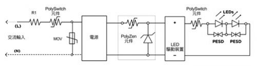 驅(qū)動輸出上的PolySwitch組件有助于防止因有害短路或其他負載異常而受損,為了充分發(fā)揮PolySwitch組件的作用,可以與金屬芯電路板或LED散熱片熱接,此外,與LED并置的PESD組件也可以對靜電放電加以保護。