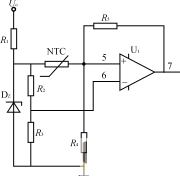 圖4為變壓器過(guò)熱保護(hù)電路,R3=R4,NTC為粘貼在變壓器上的負(fù)溫度系數(shù)的熱敏電阻,常溫下RNTCR2,運(yùn)放U1構(gòu)成滯環(huán)比較器。正常工作時(shí),NTC阻值較大,運(yùn)放U+<U-,輸出為零;當(dāng)溫度上升到設(shè)定值時(shí),運(yùn)放U1輸出為高電平,送到PWM控制芯片使輸出脈沖關(guān)斷。