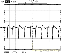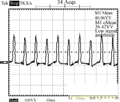 圖8~圖10為輸入電壓220V的條件下,輸出端的負(fù)載狀況分別為空載、半載和全載時(shí),輸入端的功率波形圖。由這3個(gè)圖可以看出,輸入功率是個(gè)脈沖序列,周期為10ms,即每半個(gè)工頻周期電源輸入端通過(guò)整流橋?yàn)檩斎肫交瑸V波電容充一次電。測(cè)量輸入功率時(shí)串聯(lián)于輸入端的采樣電阻為2.0Ω,因此功率為圖示值除以2。半載時(shí)輸出功率為:12.3662/10=15.29W,全載時(shí)輸出功率為:12.2552/5=30.04W。電路正常工作時(shí),漏極電壓波形如圖11所示。