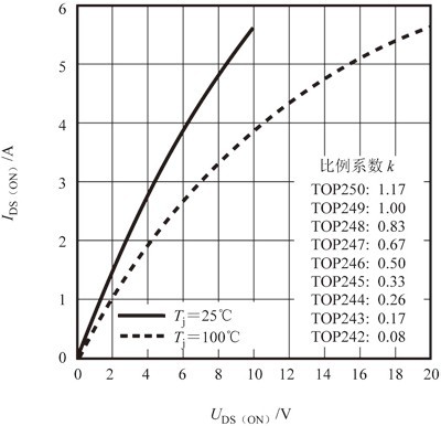 下面對開關(guān)電源散熱器的設(shè)計要點作進(jìn)一步分析。以TOPSwitch-GX(TOP242~TOP250)系列單片開關(guān)電源為例,當(dāng)MOSFET導(dǎo)通時漏-源極導(dǎo)通電流(I DS(ON) )與漏-源極導(dǎo)通電壓(U DS(ON) )的歸一化曲線如圖2所示。