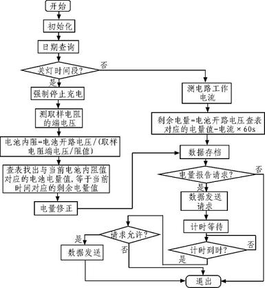 通過計算電流在時域上的積分,可得出電量變化值,在路燈工作前檢測到的電池電量作為初始電量,則剩余電量為初始電量減去電量變化值。同時通過對MPPT電路的輸出電流做積分,作為電量變化的校正值,從而得到較準(zhǔn)確的剩余電量值。圖5為剩余電量計算流程圖。