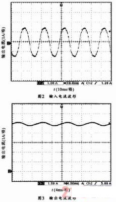 圖3所示為輸入220V,輸出滿載時的輸出電流波形。紋波電流峰峰值120mA,輸出電流中疊加有2倍市電供電頻率的紋波電流。