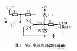 ADMC331內(nèi)的A/D轉(zhuǎn)換器由7個(gè)模擬輸入通道和比較器等電路組成,數(shù)據(jù)轉(zhuǎn)換是通過判斷模擬輸入量與片內(nèi)高穩(wěn)定度鋸齒波的交點(diǎn)來實(shí)現(xiàn)的??紤]到A/D 轉(zhuǎn)換器能接受的電平范圍為0~+5V,因此必須將電壓互感器檢測的電壓和電流傳感器檢測的電流(轉(zhuǎn)換為電壓量)按照一定比例轉(zhuǎn)換到這個(gè)范圍內(nèi)。輸出電壓和電流檢測接口電路分別如圖4和圖5所示,這部分電路的輸入阻抗應(yīng)比較大,以盡量減少對(duì)設(shè)備信號(hào)的影響,并且輸出阻抗應(yīng)同A/D轉(zhuǎn)換器的輸入阻抗相匹配。