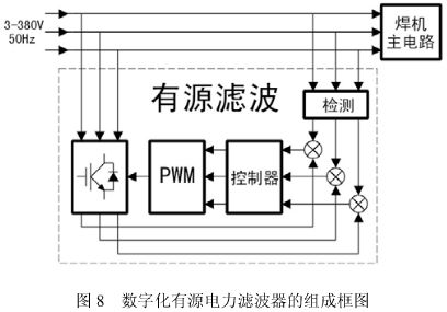 有源濾波器原理如圖 8 所示。通過檢測電路對負(fù)載端(焊機(jī)主電路)的電壓、電流進(jìn)行檢測,然后送入控制電路進(jìn)行計(jì)算分析,輸出相應(yīng)的脈沖驅(qū)動 IGBT,產(chǎn)生與負(fù)載電流中的諧波電流大小相等方向相反的電流,從而達(dá)到補(bǔ)償負(fù)載電流中的諧波分量和無功功率的目的。逆變器工作時所需要的能量由儲能電路供給,該儲能電路是通過逆變器中的各個 IGBT 的反并聯(lián)二極管進(jìn)行充電,同時又在 IGBT 開通時輸出能量,使諧波電流分量和無功功率得到補(bǔ)償。這樣,電網(wǎng)的輸入電流可實(shí)現(xiàn)為正弦波形。 有源濾波器動態(tài)響應(yīng)迅速,濾除諧波可達(dá)到 95%以上,補(bǔ)償無功細(xì)致。但有源濾波器由于電路復(fù)雜,材料成本高,運(yùn)行可靠性也不及無源濾波電路,對市場價格競爭異常激烈的 ZX7、NB 系列逆變焊機(jī)而言不太適用,但對需要作精細(xì)控制的數(shù)字化焊機(jī)而言,可能有源濾波才是其最佳選擇。