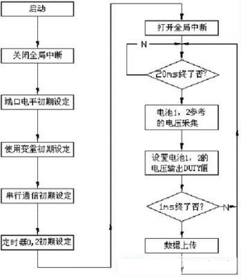 為了驗(yàn)證本文的均衡充電方法,以兩節(jié)單體電池組成的蓄電池組為例進(jìn)行實(shí)驗(yàn)和分析,主要驗(yàn)證旁路中開關(guān)管對電壓的調(diào)節(jié)作用??刂屏鞒桃妶D4。