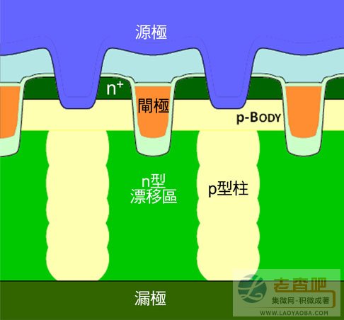 為了克服現(xiàn)有功率MOSFET結(jié)構(gòu)的缺點(diǎn),目前已經(jīng)開發(fā)出一種采用超級(jí)接面概念的新型結(jié)構(gòu)。低壓超級(jí)接面MOSFET元件的結(jié)構(gòu)如圖2所示,此結(jié)構(gòu)采用N-type和P-type矽區(qū)域交替形成一個(gè)多重RESURF結(jié)構(gòu),換言之,相當(dāng)于將橫向MOSFET結(jié)構(gòu)先平行放置后,再垂直擺放,進(jìn)而獲得RESURF結(jié)構(gòu)。這種結(jié)構(gòu)克服橫向結(jié)構(gòu)的單元間距限制,同時(shí),在漂移區(qū)內(nèi)達(dá)成RESURF無需如同以往分裂閘結(jié)構(gòu)必須依賴增加單元密度,和在每個(gè)溝槽閘下方增加CDS和CGD電容器。完成真正為DC-DC轉(zhuǎn)換量身打造的元件結(jié)構(gòu)。