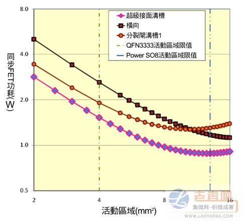 圖5 不同的功率MOSFET結(jié)構(gòu)作為同步FET時(shí),活動(dòng)區(qū)域與功耗之間的關(guān)系。開關(guān)頻率為1MHz時(shí),輸出電流為25安培。電壓由12伏特轉(zhuǎn)換為1.2伏特,閘極驅(qū)動(dòng)電壓為5伏特。