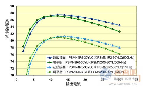 為展現(xiàn)超級(jí)接面功率MOSFET結(jié)構(gòu)的優(yōu)點(diǎn),可對(duì)系統(tǒng)效率進(jìn)行測(cè)量,并將測(cè)量結(jié)果與超級(jí)接面元件和晶片尺寸相似的場(chǎng)平衡結(jié)構(gòu)元件做比較,工作頻率為500kHz和1MHz、電壓從12伏特轉(zhuǎn)換為1.2伏特(圖6)。當(dāng)二者的晶片尺寸相同時(shí),前者的導(dǎo)通狀態(tài)損耗優(yōu)于后者。當(dāng)工作頻率為500kHz和1MHz時(shí),在30安培全負(fù)載和低負(fù)載條件下,系統(tǒng)效率均提高2%。超級(jí)接面晶片尺寸無論大小,均有可能出現(xiàn)下列情形,如重負(fù)載條件下的效率提升會(huì)犧牲輕負(fù)載效率,而輕負(fù)載條件的系統(tǒng)效率提升會(huì)犧牲重負(fù)載效率。采用RDS(on)較高的控制FET可能會(huì)改善效率,因?yàn)镼GD降低所帶來的益處大于RDS(on)升高所帶來的壞處。