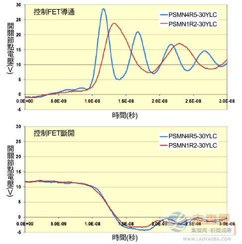 圖7 PSMN4R5-30YLC和PSMN1R2-30YLC在導(dǎo)通和斷開時(shí)的開關(guān)節(jié)點(diǎn)波形(即同步FET的VDS)