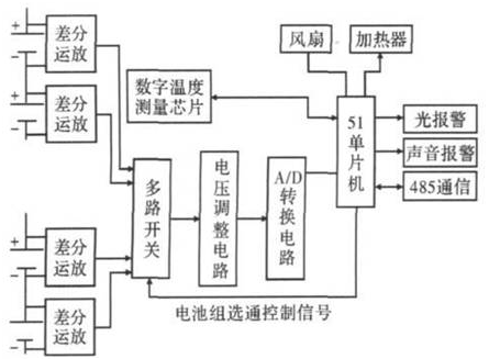 具有高電壓、高容量、循環(huán)壽命長、安全性能好等優(yōu)點(diǎn)的鋰離子電池,在便攜式電子設(shè)備、電動(dòng)汽車、空間技術(shù)、國防工業(yè)等多方面具有廣闊的應(yīng)用前景。由若干節(jié)鋰離子電池經(jīng)串聯(lián)組成的動(dòng)力鋰離子電池組目前應(yīng)用最為廣泛。由于每節(jié)單體電池的電壓不一致,使用中電池不允許過充電、過放電,電池的性能和壽命受溫度影響較大等特點(diǎn),必須對(duì)串聯(lián)鋰離子電池組進(jìn)行監(jiān)測(cè),確保在使用中鋰離子電池具有良好的狀態(tài),或者使用中電池出現(xiàn)問題立即報(bào)警,電源管理系統(tǒng)立即采取保障措施,并提醒相關(guān)人員檢修。單體電壓和電池組的溫度是辨別串聯(lián)鋰離子電池組是否正常工作的主要技術(shù)指標(biāo)。采用直接采樣法,將要測(cè)量的單體電池電壓存儲(chǔ)在非電容上進(jìn)行測(cè)量。該方法反應(yīng)時(shí)間慢、誤差較大、控制復(fù)雜; 采用運(yùn)放和光藕繼電器來測(cè)量串聯(lián)電池組的單體電壓。該方法對(duì)光耦的線性度要求很高,導(dǎo)致硬件成本較高。目前,直接采用集成芯片的串聯(lián)鋰離子電池組監(jiān)控系統(tǒng)受到青睞,但該方法串聯(lián)電池的數(shù)目固定,導(dǎo)致應(yīng)用不靈活、硬件成本高等缺點(diǎn)。文中研制了一種動(dòng)力鋰離子電池組監(jiān)測(cè)系統(tǒng),對(duì)串聯(lián)鋰離子電池組的單體電壓和電池組的溫度進(jìn)行在線監(jiān)測(cè),當(dāng)單體電池電壓偏離規(guī)定區(qū)間時(shí),監(jiān)測(cè)系統(tǒng)啟動(dòng)報(bào)警程序進(jìn)行聲、光報(bào)警; 當(dāng)電池組溫度偏離規(guī)定的區(qū)間時(shí),監(jiān)測(cè)系統(tǒng)啟動(dòng)風(fēng)扇或加熱控制電路,并存儲(chǔ)有關(guān)數(shù)據(jù),確保電池組正常工作。整個(gè)監(jiān)測(cè)系統(tǒng)具有連續(xù)測(cè)量分量、簡(jiǎn)單經(jīng)濟(jì)、精度高和可靠性高的特點(diǎn)。