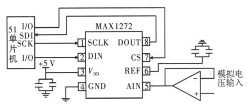 圖4 中MAX1272 采用了內(nèi)部參考電壓,6 腳VREF 和地之間接2. 2 μF 鉭電容和0. 1 μF 陶瓷電容。