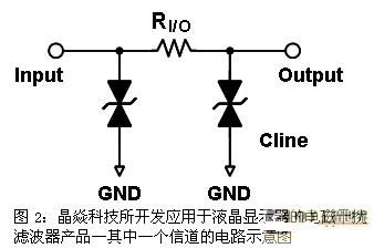 晶焱科技(Amazing Microelectronic Corp.)在靜電放電防護技術(shù)上已累積了豐富的經(jīng)驗與技術(shù)。公司開發(fā)的應(yīng)用于液晶顯示器的電磁干擾濾波器產(chǎn)品基本架構(gòu)如圖2所示。由圖2電路示意圖可知:π型低通濾波器的Input與Output之間是采用電阻(RI/O)組件橋接,Input端點及Output端點對GND的電容則是采用雙向?qū)?bi-directional)的瞬時電壓抑制器(TVS)。因此,該系列產(chǎn)品除了可以提供良好的低通濾波效果之外,還擁有很好的靜電放電防護效果。