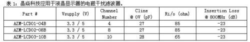 表1所列為晶焱科技已推出的應(yīng)用于液晶顯示器的電磁干擾濾波器系列產(chǎn)品。適用于5V以下的額定電壓電路系統(tǒng),線電容值約為27微微法拉(pF)。操作頻率在800百萬赫茲(MHz)時,其功率損耗可達-23dB,可以顯著地降低電磁干擾信號,以維持受保護電路的操作功能正常。晶焱科技同時推出三種不同通道數(shù)的電磁干擾濾波器產(chǎn)品,以方便其客戶依照不同需求選用合適的產(chǎn)品。