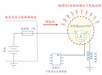 圖1. 阻性模式下的PowerFET故障可能形成不安全的溫度情況