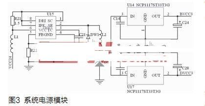 控制單元內(nèi)部單片機(jī)的供電為3.3V,其他芯片和模擬器件的供電在3V到10V之間。控制單元的電源輸入是由外部開關(guān)電源提供的。在生產(chǎn)現(xiàn)場(chǎng),開關(guān)電源與水泵電機(jī)共用一路交流電,水泵在運(yùn)行過程中會(huì)引起開關(guān)電源的輸出波動(dòng),若不采取防浪涌措施勢(shì)必會(huì)影響到單片機(jī)的正常工作。根據(jù)上述分析設(shè)計(jì)系統(tǒng)電源模塊如圖3所示。電感L1起防浪涌保護(hù)作用;輸入電壓經(jīng)開關(guān)電源芯片MC34063后輸出12V電壓,然后通過兩個(gè)NCP1117ST33穩(wěn)壓芯片產(chǎn)生兩路3.3V電源分別給單片機(jī)和光電接收電路供電。