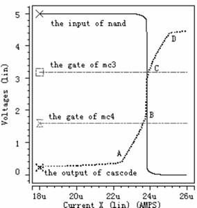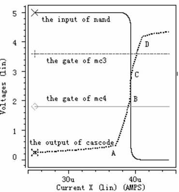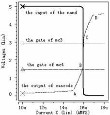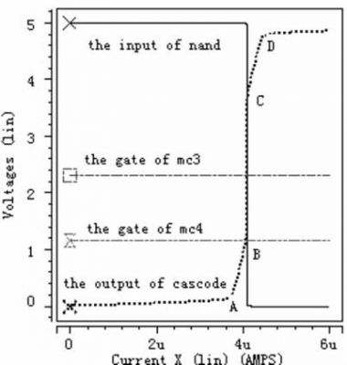 從虛線即cascode 結(jié)構(gòu)的輸出電壓波形可以看出,電流極限比較器的工作過程分為五個(gè)階段, 第一階段: 檢測(cè)電流從0 慢慢上升到A, 在此過程中, 由于檢測(cè)電流遠(yuǎn)小于極限電流, 強(qiáng)迫Mc3 和Mc4 都工作于線性區(qū)。第二階段: 檢測(cè)電流從A 上升到B, cascode結(jié)構(gòu)的輸出電壓也隨著上升, 使Mc4 工作于飽和區(qū), Mc3 工作于線性區(qū)。但是Mc4 只是剛剛進(jìn)入飽和區(qū),還受溝道調(diào)制因素影響, 這可從圖中很清析地看出當(dāng)cascode 結(jié)構(gòu)的輸出電壓隨檢測(cè)電流上升時(shí), Mc4 中電流慢慢接近所設(shè)定的極限電流。第三階段: 檢測(cè)電流從B 上升到C, 此時(shí)檢測(cè)電流已上升到所設(shè)定的極限電流, Mc3 和Mc4 都工作于飽和區(qū), 同時(shí)cascode 結(jié)構(gòu)的輸出電壓也上升到后面反相器的中點(diǎn)電壓, 經(jīng)過后續(xù)控制電路關(guān)斷功率管。第四階段:檢測(cè)電流從C 上升到D, 此時(shí)檢測(cè)電流大于所設(shè)定的極限電流, 迫使Mc5 工作于線性區(qū), 雖Mc6 還工作于飽和區(qū),但受溝道調(diào)制因素影響, 另外Mc3 和Mc4 工作于飽和區(qū)。第五階段: 檢測(cè)電流從D 繼續(xù)往上升, 迫使Mc5 和Mc6 都工作于線性區(qū),Mc3 和Mc4 工作于飽和區(qū)。從圖4 中可以看出, 當(dāng)檢測(cè)電流達(dá)到4.1μA 時(shí), 關(guān)斷功率管,滿足系統(tǒng)要求。圖5- - 圖7 的工作情況與圖4 類似, 圖5 設(shè)定極限電流為16μA, 可以看出當(dāng)檢測(cè)電流達(dá)到15.97μA 時(shí),關(guān)斷功率管。圖6 設(shè)定極限電流為24μA, 可以看出當(dāng)檢測(cè)電流達(dá)到23.82μA 時(shí), 關(guān)斷功率管。圖7 設(shè)定極限電流為40μA, 可以看出當(dāng)檢測(cè)電流達(dá)到39.6μA 時(shí), 關(guān)斷功率管。