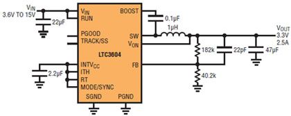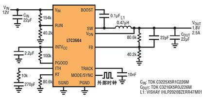很多微處理器都需要 1.x 的低電壓軌,但是它們也用于需要高開關(guān)頻率的應(yīng)用中,這類應(yīng)用以高開關(guān)頻率保持采用外型很小的無(wú)源組件、并使關(guān)鍵頻段避開 RF 干擾。問題是,要實(shí)現(xiàn)高降壓比和高開關(guān)頻率這不可思議的組合可能是難以捉摸的,因?yàn)樾枰@么短的最短接通時(shí)間。圖 5 顯示 LTC3604 用在一個(gè) 4MHz、12V 至 1.8V 應(yīng)用中的原理圖。這個(gè)應(yīng)用要求的 38ns 接通時(shí)間遠(yuǎn)大于 LTC3604 的 20ns 最短接通時(shí)間。