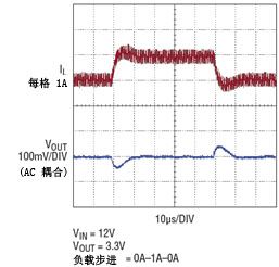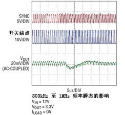 有些應(yīng)用在工作時(shí)要求移動(dòng)開關(guān)頻率,通常是為了避開相鄰無(wú)線接收器的干擾。圖 3 顯示了甚至當(dāng) MODE/SYNC 引腳引入的同步頻率迅速變化時(shí),輸出電壓的偏離也是很小。