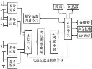 具有高電壓、高容量、循環(huán)壽命長(zhǎng)、安全性能好等優(yōu)點(diǎn)的鋰離子電池,在便攜式電子設(shè)備、電動(dòng)汽車、空間技術(shù)、國(guó)防工業(yè)等多方面具有廣闊的應(yīng)用前景。由若干節(jié)鋰離子電池經(jīng)串聯(lián)組成的動(dòng)力鋰離子電池組目前應(yīng)用最為廣泛。由于每節(jié)單體電池的電壓不一致,使用中電池不允許過充電、過放電,電池的性能和壽命受溫度影響較大等特點(diǎn),必須對(duì)串聯(lián)鋰離子電池組進(jìn)行監(jiān)測(cè),確保在使用中鋰離子電池具有良好的狀態(tài),或者使用中電池出現(xiàn)問題立即報(bào)警,電源管理系統(tǒng)立即采取保障措施,并提醒相關(guān)人員檢修。單體電壓和電池組的溫度是辨別串聯(lián)鋰離子電池組是否正常工作的主要技術(shù)指標(biāo)。文獻(xiàn)[1]采用直接采樣法,將要測(cè)量的單體電池電壓存儲(chǔ)在非電容上進(jìn)行測(cè)量。該方法反應(yīng)時(shí)間慢、誤差較大、控制復(fù)雜;文獻(xiàn)[2]采用運(yùn)放和光藕繼電器來測(cè)量串聯(lián)電池組的單體電壓。該方法對(duì)光耦的線性度要求很高,導(dǎo)致硬件成本較高。目前,直接采用集成芯片的串聯(lián)鋰離子電池組監(jiān)控系統(tǒng)受到青睞,但該方法串聯(lián)電池的數(shù)目固定,導(dǎo)致應(yīng)用不靈活、硬件成本高等缺點(diǎn)。文中研制了一種動(dòng)力鋰離子電池組監(jiān)測(cè)系統(tǒng),對(duì)串聯(lián)鋰離子電池組的單體電壓和電池組的溫度進(jìn)行在線監(jiān)測(cè),當(dāng)單體電池電壓偏離規(guī)定區(qū)間時(shí),監(jiān)測(cè)系統(tǒng)啟動(dòng)報(bào)警程序進(jìn)行聲、光報(bào)警;當(dāng)電池組溫度偏離規(guī)定的區(qū)間時(shí),監(jiān)測(cè)系統(tǒng)啟動(dòng)風(fēng)扇或加熱控制電路,并存儲(chǔ)有關(guān)數(shù)據(jù),確保電池組正常工作。整個(gè)監(jiān)測(cè)系統(tǒng)具有連續(xù)測(cè)量分量、簡(jiǎn)單經(jīng)濟(jì)、精度高和可靠性高的特點(diǎn)。
