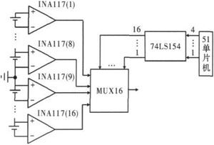 每節(jié)鋰離子電池最高電壓為5V,由圖3可得,第1個(gè)INA117的3腳的輸入電勢(shì)最高為40V。同理,第16個(gè)INA117的2腳輸入電勢(shì)最低為-40V。第1至8個(gè)INA117的輸出電壓為正,第9至16個(gè)INA117的輸出電壓為負(fù),所以多選一模擬開關(guān)和A/D轉(zhuǎn)換器都要求可以輸入正、負(fù)電壓。多選一模擬開關(guān)選用MUX16,為16選1可正負(fù)電壓輸入模擬開關(guān),因此16節(jié)電池只需1個(gè)MUX16.但由于單片機(jī)IO口有限,文中用一片74LS154擴(kuò)展了IO口,僅用單片機(jī)的4個(gè)IO口即可控制MUX16分別選通單節(jié)鋰離子電池進(jìn)行電壓采樣。