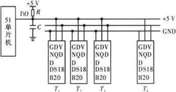 針對(duì)串聯(lián)電池組,傳統(tǒng)的測(cè)溫方法多采用模擬溫度傳感器進(jìn)行測(cè)量,在數(shù)據(jù)的采集和傳輸過程中易受外界環(huán)境的干擾,從而使測(cè)得的結(jié)果誤差較大,且當(dāng)測(cè)量點(diǎn)較多時(shí),連線較復(fù)雜。文中采用單片機(jī)和單總線數(shù)字式溫度傳感器DS18B20來解決上述問題[5]。其原理如圖5所示。