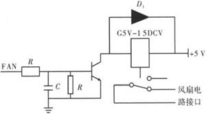 電路如圖6所示,F(xiàn)AN為低電平時(shí),晶體管9014不導(dǎo)通,此時(shí)繼電器無動(dòng)作;當(dāng)FAN為高電平時(shí),晶體管9014導(dǎo)通,使得繼電器觸點(diǎn)吸合,風(fēng)扇在24V電源電壓的供電下開始工作。