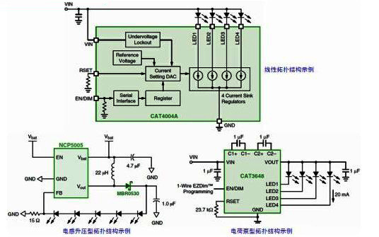 白光LED廣泛用于小型液晶顯示器(LCD)面板及鍵盤背光以及指示器應(yīng)用。高亮度LED則用于手機(jī)和數(shù)碼相機(jī)的閃光光源。這些應(yīng)用需要優(yōu)化的驅(qū)動(dòng)器解決方案,能夠延長(zhǎng)電池使用時(shí)間、減小印制電路板(PCB)面積及高度。在這些應(yīng)用領(lǐng)域,常見的LED驅(qū)動(dòng)器方案涉及線性、電感型或電荷泵型不同拓?fù)浣Y(jié)構(gòu),各有其特點(diǎn)。例如,電感型方案總能效最佳;電荷泵方案由于使用低高度陶瓷電容,占用的電路板面積和高度極??;線性方案非常適合色彩指示器以及簡(jiǎn)單的背光應(yīng)用。安森美半導(dǎo)體提供所有這三種類型拓?fù)浣Y(jié)構(gòu)的LED驅(qū)動(dòng)器方案(參見圖1),滿足用戶不同的應(yīng)用需求。