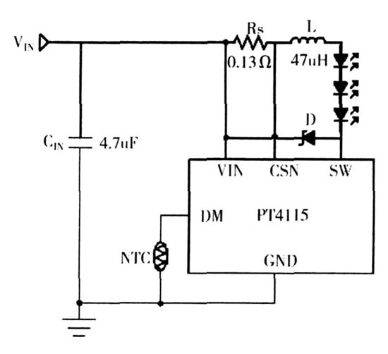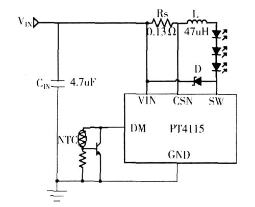 4) PT4115 內(nèi)部自帶過(guò)溫保護(hù)功能,外部過(guò)溫保護(hù)可設(shè),對(duì)LED 實(shí)現(xiàn)雙重保護(hù);