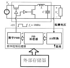 隨著數(shù)字芯片和電源技術的發(fā)展,現(xiàn)在出現(xiàn)了為電源控制而開發(fā)出來的控制處理器,它不同于數(shù)字芯片的中央處理器。控制處理器主要由高速AD轉換器,數(shù)字PID補償器和數(shù)字PWM輸出三部分組成。反饋環(huán)路的控制由它來完成,中央處理器作為管理模塊應用在電源上。其原理圖如圖3所示: