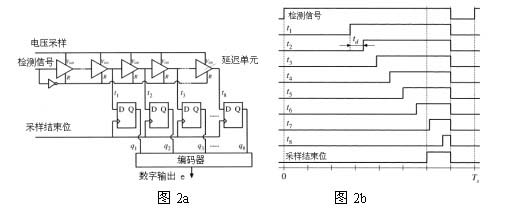 [page]控制處理器由高速A/D轉換器,數(shù)字PID補償器和數(shù)字DPWM輸出組成。外部存儲器記錄了控制處理器的相關程序。高速A/D轉換器是基于CMOS的傳輸延遲時間td 影響輸入電壓VDD的原理做成的,VDD電壓和傳輸時間是成近似的反比例關系,即VDD越大,信號傳輸延遲時間越小。如圖2所示,以CMOS的輸入電壓VDD作位采樣電壓的輸入口,各信號之間的傳輸時間延時td受采樣電壓VDD影響。第四分之三個采樣周期過后采樣結束位產(chǎn)生高電平,開始記錄q1到q8的輸出,把得到的結果送入編碼器得到數(shù)字輸出e,完成A/D轉換。如圖2b所示,數(shù)字采樣值為11111100.VDD越大,td越小得到的采樣值越大。