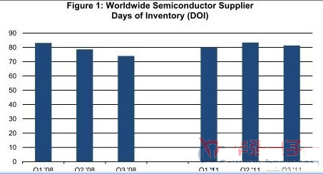 第三季度半導(dǎo)體庫(kù)存天數(shù)(DOI)為81天,比第二季度的83天下降2.5%。自從2009年第四季度以來(lái),庫(kù)存天數(shù)就持續(xù)增加。2009年第四季度庫(kù)存天數(shù)只有67天,由于需求在衰退時(shí)期蒸發(fā),當(dāng)時(shí)庫(kù)存較低。此后,庫(kù)存天數(shù)不斷攀升,如圖1所示。庫(kù)存上升,一方面是因?yàn)樾枰a(bǔ)充衰竭的庫(kù)存,同時(shí)也是為了滿(mǎn)足不斷增長(zhǎng)的需求。第三季度庫(kù)存約為369.6億美元,低于第二季度時(shí)的372.9億美元。