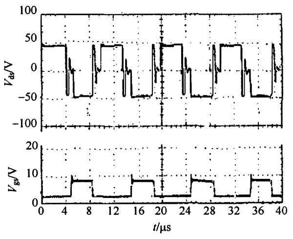 通過(guò)理論研究及仿真分析, 可以看出, 交錯(cuò)并聯(lián)的低壓大電流DC - DC 變換器具有良好的性能,在輸出為1125 V/ 60 A 的情況下, 輸出電流紋波可以降到很小。為了進(jìn)一步說(shuō)明這種拓?fù)浣Y(jié)構(gòu)的可行性, 用實(shí)驗(yàn)結(jié)果驗(yàn)證。實(shí)驗(yàn)電路見圖4 , 實(shí)驗(yàn)參數(shù)和仿真相同, 最后得到如圖9 所示的實(shí)驗(yàn)波形。圖9 中, V gs為一次側(cè)一個(gè)MOSFET 的門極驅(qū)動(dòng)電壓波形, V ds則為相應(yīng)的MOSFET 的柵源電壓波形,從圖9 可以看出, 實(shí)驗(yàn)結(jié)果所得波形同圖5 的理論分析結(jié)果十分吻合, 所提出的方法是可行的。其中, 變壓器選用R2 KB 軟磁鐵氧體材料制作的GU22 磁心, 原副邊的匝數(shù)分別為8 匝和1 匝; 電感選用寬恒導(dǎo)磁材料IJ 50h 制作的環(huán)形鐵心T5 - 10 - 215 ,匝數(shù)為8 匝。