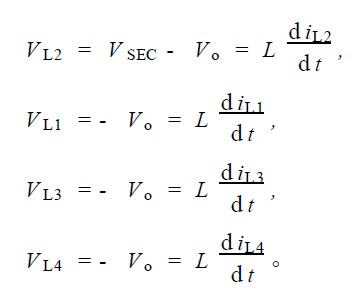 2) S2 導(dǎo)通, S1 截止; S4 截止, S3 , S5 , S6 均導(dǎo)通。由于S3 , S5 , S6 的導(dǎo)通, 第一變壓器副邊繞組上端為零電位,第二變壓器副邊繞組上、下端均為零電位, 電感L2 上電流上升, L1 , L3 , L4 上電流下降。