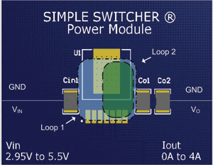 在規(guī)劃電源布局時,首先要考慮的是兩個開關(guān)電流環(huán)路的物理環(huán)路區(qū)域。雖然在電源模塊中這些環(huán)路區(qū)域基本看不見,但是了解這兩個環(huán)路各自的電流路徑仍很重要,因為它們會延至模塊以外。在圖1所示的環(huán)路1中,電流自導通的輸入旁路電容器(Cin1),在高端MOSFET的持續(xù)導通時間內(nèi)經(jīng)該MOSFET,到達內(nèi)部電感器和輸出旁路電容器(CO1),最后返回輸入旁路電容器。
