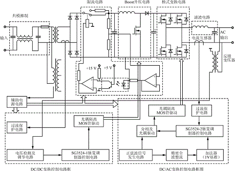 圖1示出了系統(tǒng)主電路和控制電路框圖。交流輸入電壓經過共模抑制環(huán)節(jié)后,再經工頻變壓器降壓,然后整流得到一個直流電壓,此電壓經過Boost電路進行升壓,在直流環(huán)上得到一個符合要求的直流電壓350V(50Hz/220V交流輸出時)。DC/AC變換采用全橋變換電路。為保證系統(tǒng)可靠運行,防止主電路對控制電路的干擾,采用主、控電路完全隔離的方法,即驅動信號用光耦隔離,反饋信號用變壓器隔離,輔助電源用變壓器隔離。過流保護電路采用電流互感器作為電流檢測元件,其具有足夠快的響應速度,能夠在MOS管允許的過流時間內將其關斷。
