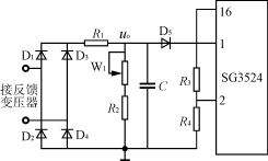 反饋調壓電路圖如圖7所示。當逆變器正常工作時,逆變器的輸出信號接反饋變壓器,其二次電壓經整流,濾波,分壓得到反饋電壓uo,顯然,uo的大小正比于逆變器的輸出電壓。調節(jié)W1可調節(jié)負反饋電壓的大小,從而調節(jié)逆變器輸出電壓的幅值。uo控制信號被送到SG3524-1芯片的誤差放大器的反相端腳1。誤差放大器的同相端腳2接參考電平。這樣,SG3524的輸出脈沖的占空比就受到反饋信號的控制。調節(jié)過程是這樣的,當逆變器輸出因突加負載而降低時,它會使加在SG3524-1的腳1的輸入反饋電壓下降,這會導致SG3524-1輸出脈沖占空比增加,從而使得Boost電路輸出電壓升高,逆變橋的直流電壓升高,逆變器輸出交流電壓升高。反之亦然。可見,正是通過SG3524-1的脈寬調制組件的控制作用,實現(xiàn)了整個逆變器的輸出自動穩(wěn)壓調節(jié)功能。