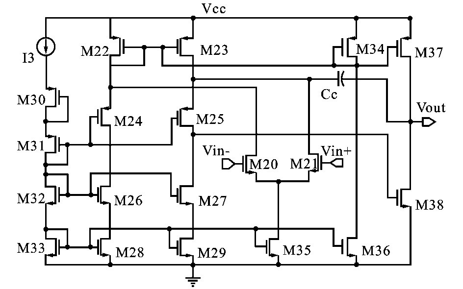 以上分析可知運算放大器起著重要作用,其必須具有較高的增益,才能使A 點電壓精確跟隨參考電壓,從而準(zhǔn)確設(shè)定B 點電平和滯環(huán)電壓大小。 另外由于V out的變化頻率與系統(tǒng)開關(guān)頻率相同(系統(tǒng)的最大開關(guān)頻率約為2MHz) ,使得流過M1 的電流也相同頻率在IM1和I′M1之間快速切換,所以運放的單位增益帶寬須大于系統(tǒng)的最大開關(guān)頻率。 設(shè)計的運放結(jié)構(gòu)如圖4 所示,采用折疊式輸入結(jié)構(gòu),可以獲得較大的共模輸入電壓范圍。