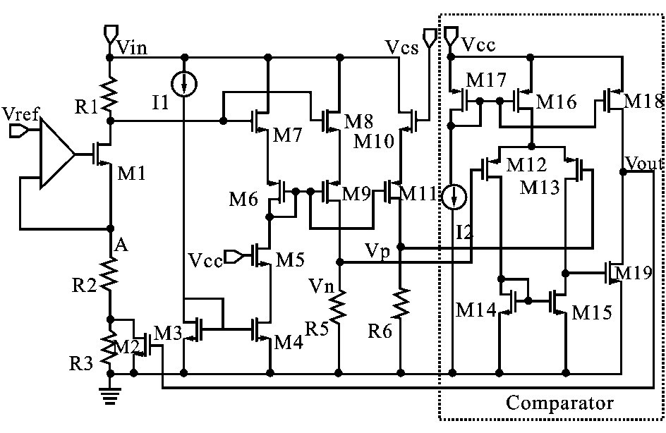 4. 5V~28V 的輸入電壓經(jīng)調(diào)整轉(zhuǎn)換為5V 的恒定電壓Vcc 為后續(xù)電路供電。 如圖3 所示,A 點電位受運算放大器鉗制,將等于參考電壓1. 2V ,假設(shè)輸出V out 為高電平,則M2 導(dǎo)通,流過M1 的電流為IM1 = V ref / R2 ,B 點的電壓為V BL = V in - IM1 R1 ;當(dāng)V out為低電平,M2 截止,流過M1 的電流變?yōu)镮′M1= V ref / ( R2 + R3 ) ,B 點電壓升高為V BH = V in -I′M1 R1 ,所以B 點電壓的變化為ΔV B = V BH - V BL= V ref R1 R3/ R2 ( R2 + R3) ,這意味著V out由高電平變成低電平時在B 點產(chǎn)生的一個滯環(huán)電壓,可見該滯環(huán)電壓與輸入電壓無關(guān),只由參考電壓V ref和電阻大小決定,通過選擇各電阻的阻值便可設(shè)定滯環(huán)電壓的大小。