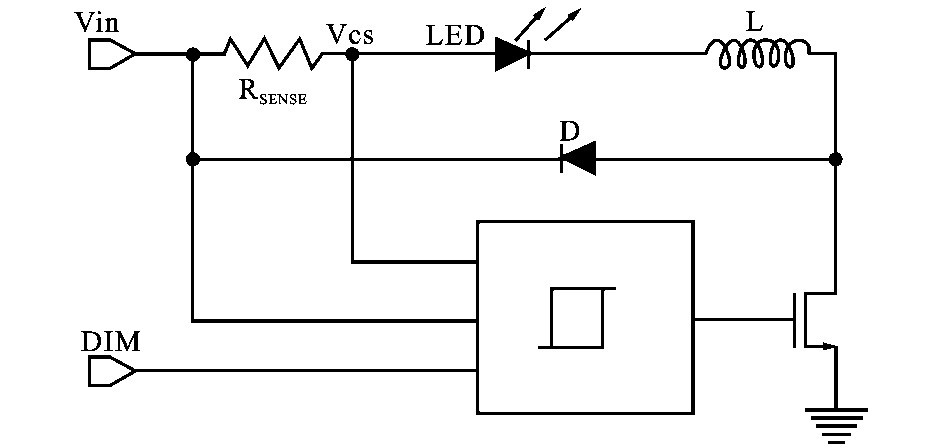 滯流控制模塊應(yīng)用如圖1 所示,L ED 驅(qū)動電流的變化反應(yīng)在檢測電阻RSENSE兩端的壓差變化上。 本設(shè)計中,檢測電阻設(shè)為0. 5Ω ,較小的檢測電阻有利于降低功耗和保持較高的轉(zhuǎn)換效率。 滯環(huán)電流控制模塊內(nèi)部自建兩個電壓閾值,檢測電壓Vcs與閾值電壓進行比較,比較結(jié)果和DIM 調(diào)光信號相與來控制功率開關(guān)管的通斷。