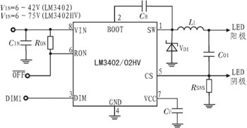 高亮度白光二極管一般采用恒流電源驅動。因為隨著LED逐漸變熱,其電壓降將減小,而且若LED串由恒壓電源供電的話,電源往往會持續(xù)提供過多的電流,使輸出電壓增大,直到電源達到電流限值或LED失效。脈寬調制方式是用較高的頻率開關LED,開關頻率超出人一般能夠察覺的范圍,給人一種LED總亮的假象,現(xiàn)在普遍采用脈寬調制方式調節(jié)LED的亮度,在某些應用中,調光比可達5 000:1,常用的LED驅動有降壓型(Buck)、升壓型(Boost)、升降壓型(Buck~Boost)等3種。LM3402是一款由可控電流源衍生的降壓型穩(wěn)壓器,輸入電壓范圍涵蓋整個汽車應用領域,內置MOS管最多可以驅動5顆LED,性價比高,且接受領域較廣、線路簡潔實用,是眾多LED驅動IC中間的佼佼者。