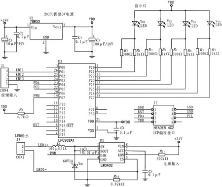 P89LPC932是由飛利浦生產的低功耗單片微處理器,電源電壓3.3V,可低功耗運行,適合于許多要求高集成度、低成本的場合??梢詽M足多方面的性能要求。P89LPC932采用了高性能的處理器結構,指令執(zhí)行時間只需2~4個時鐘周期,6倍于標準80C51器件。P89LPC932集成了許多系統(tǒng)級的功能,這樣可大大減少元件的數(shù)目、電路板的面積以及系統(tǒng)的成本,其內部有2個定時器,可作為一個具有256個定時器時鐘周期的PWM發(fā)生器使用。LED調光電路電氣原理圖如圖2所示。