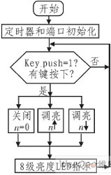 控制器程序根據3個按鈕的輸入狀態(tài),實現(xiàn)開關或亮度調節(jié),并將亮度狀態(tài)在4個指示燈上顯示出來。利用微處理器自身集成的EEPROM單元,可隨時保存亮度狀態(tài)n(PWM占空比)。主程序流程框圖如圖3所示。