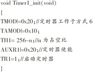 微處理器P89LPC932內部定時器TO/T1的PWM輸出與計數(shù)輸入和定時器觸發(fā)輸出占用相同的管腳,發(fā)生定時器溢出時自動觸發(fā)端口輸出。此功能通過AUXR1寄存器中的控制位ENT0和ENT1分別使能定時器0和1。該模式打開時,在首次定時器溢出前端口的輸出為邏輯1。為了使該模式生效,必須清零C/T位以選擇PCLK作為定時器的時鐘源。定時器初始化設置參考程序如下: