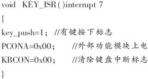 經檢測,在同等照度要求的情況下,采用LED調光控制系統(tǒng)的功耗較白熾燈降低90%以上,當然為進一步降低能耗,節(jié)能方法的探究仍然具有十分重要的意義。在多數(shù)時間,HBLEDs可能處于熄滅狀態(tài),若控制系統(tǒng)處于待機狀態(tài)或掉電狀態(tài),可將功耗降低到最低;或將OFF端口接地,也可將LM3402置于一個極低的低功率關機狀態(tài)。將微處理器P89LPC932的電源控制寄存器PCONA設置為0xFF時,外部功能模塊掉電;將電源控制寄存器PCON設置為03H時,可將微處理器處于完全掉電狀態(tài),只有在中斷觸發(fā)的時候,才能喚醒,隨即給外部功能模塊上電,微處理器開始工作。微處理器主要通過鍵盤中斷喚醒,鍵盤中斷參考程序如下: