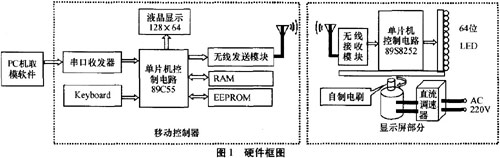 硬件系統(tǒng)主要有移動控制器和顯示屏兩部分組成,如圖1所示。移動控制器主要負責接收PC機端軟件取摸數(shù)據(jù)、加入控制字符并保存,還能向顯示屏發(fā)送特定控制命令、切換顯示內(nèi)容、改變顯示效果。顯示屏主要有電機控制轉(zhuǎn)速和單片機控制E3jLED顯示內(nèi)容等。