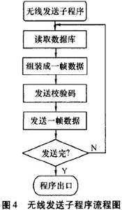 程序上電初始化后,處于等待狀態(tài)。當串口中斷一來I臨,優(yōu)先處理串口中斷.發(fā)送無線數(shù)據(jù)是通過鍵盤、菜單控制。移動控制器主程序流程圖見圖3;無線發(fā)送子程序見圖4。