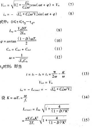從開關(guān)sa斷開到電壓vds1諧振至零的過程,即工作區(qū)間[t4~t5]和[t5~t0′]。要實(shí)現(xiàn)主開關(guān)s零電壓軟開通,其導(dǎo)通驅(qū)動延遲時間必須大于以上兩區(qū)間之和。