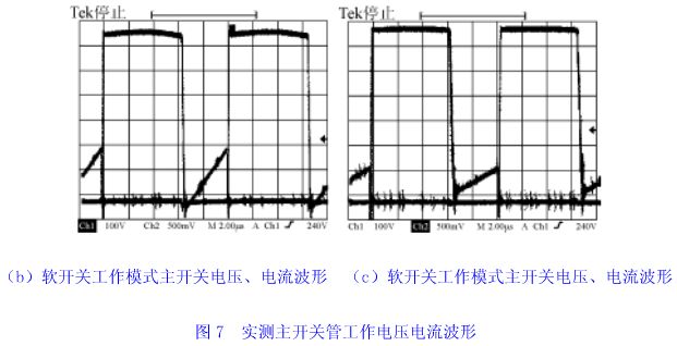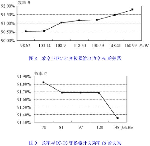 圖7(a)、7(b)、7(c)給出了實(shí)測的主開關(guān)管工作電壓、電流波形。圖7(a)顯示主開關(guān)管工作在硬開關(guān)狀態(tài)。圖7(b)和圖7(c)分別是采用增加勵磁電流方法和應(yīng)用磁飽和電感器方法實(shí)現(xiàn)零電壓軟開關(guān)的電壓電流波形,后者明顯地降低了勵磁電流和開關(guān)管電流的峰值。實(shí)測波形與理論分析完全一致。圖8、9顯示出了實(shí)測的效率曲線。從圖9中看出,當(dāng)變換器開關(guān)頻率增加時,變壓器勵磁電流損耗和開關(guān)管通態(tài)損耗所占比重增加,變換器效率降低了。實(shí)驗結(jié)果驗證了理論分析。